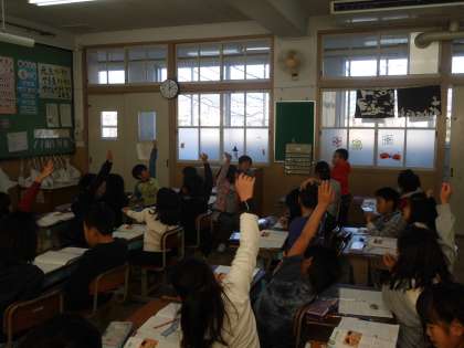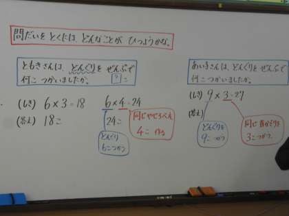 算数の学習の様子です。自分が考えたことを発表する際には,友だちの意見を受けて発表します。「○○さんの付け足しで・・・。」「○○さんと違って・・・。」みんな自信をもって活発に発表しています。