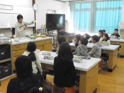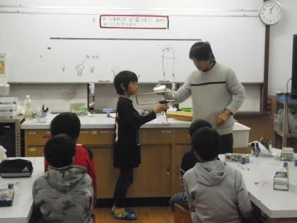 理科「豆電球に明かりをつけよう」の学習です。豆電球と乾電池を使い,回路を作って豆電球の明かりをつけます。実験を通して学習を進めています。