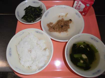 ごはん・牛乳・ツナそぼろ丼(具)・ほうれん草のごま煮・すまし汁
