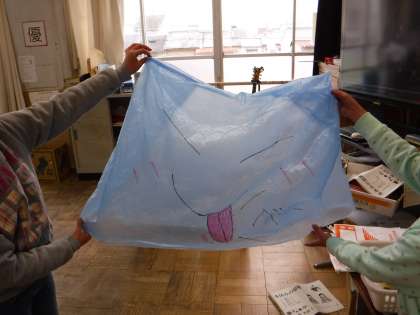 と言うと,あっと言う間におばけの被り物に改造してくれる子どもたち。創作意欲は抜群です。