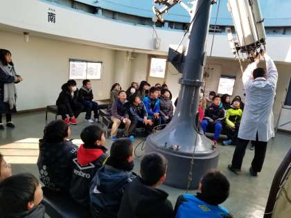 1組は地学の学習です。太陽の光を観察します。科学センターにある天文台の大きな望遠鏡にみんな興味津々です。
