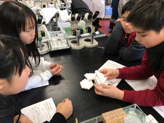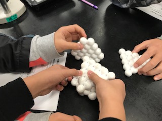 結晶の構造を模型で考えています。粒子が規則正しくきっちり並んでいる様子がよく分かりました。