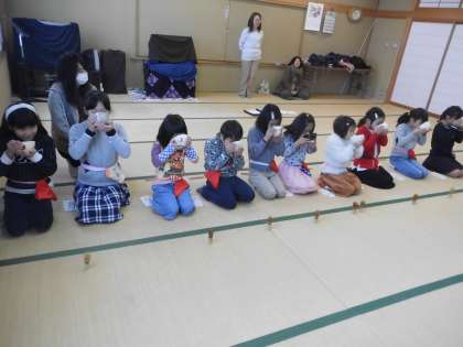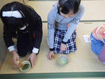 新年初めてのお茶会ということで,「はなびらもち」が用意される中で茶道体験です。地域の先生と一緒にお茶の世界をしっかりと堪能することができました。
