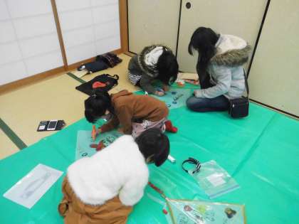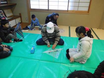1月14日の全梅津たこあげ大会に向けて,地域の方々にも協力していただきながら親子でたこ作りをしました。今年は戌年ということで,犬のイラストもたくさん見られました。出来上がると早速に中庭に出て,うまくあがるか試していました。