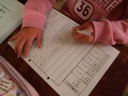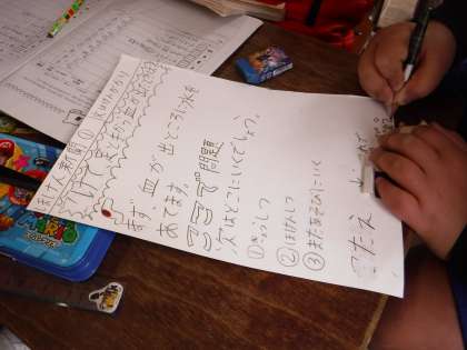 道徳の学習の最後には,振り返りにワークシートを書いています。身近な題材を扱うと,3年生の子どもたちは自分のことに照らし合わせて書きやすいようです。書いた感想を見せようと,やる気にあふれています。