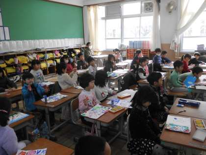 図工の時間,スタンプしながら版画を作ってきましたが,ようやく完成しました。今日は台紙に貼って,作品展に出展できるようにしました。カラフルな作品がたくさん出来上がりました。みんなの作品を鑑賞するのも楽しめそうです。