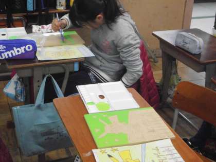 図工では「玉転がしゲーム」の作成に入りました。まずは板に絵を描いていきます。みんなていねいに絵の具で色を塗っていました。次は,かなづちを使って釘を打っていきます。