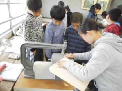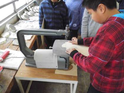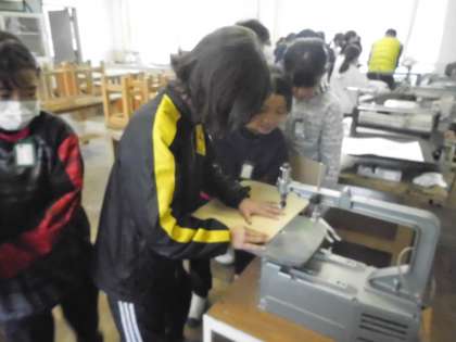 図工では伝言板の作成に入りました。下絵をもとに,電動のこぎりを使って切っていきます。操作にまだまだ慣れない様子ですが,みんな慎重に作業を進めていました。
