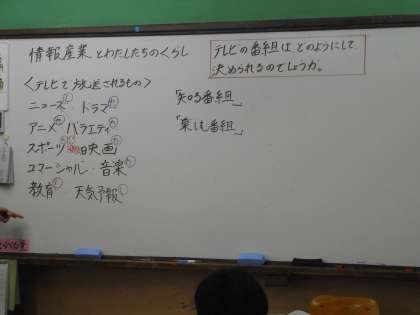 社会では情報の学習に入りました。今日は,新聞のテレビ番組欄を見ながら,どんな番組があるのか調べていきました。みんなに情報を伝えてくれるニュース番組もたくさん報道されていることがわかりました。