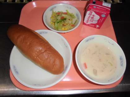 味付けコッペパン・牛乳・豆乳のクリームシチュー・野菜のソテー