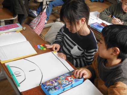 算数「大きいかず」では,友だちとおはじきゲームをして得点を競い合いました。得点を数えるには,たし算をしていかないといけません。友だちと協力して計算していました。