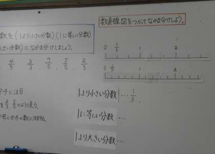 算数「分数」の学習の様子です。「1より大きい分数」「1に等しい分数」「1より小さい分数」と仲間分けをして,どのような特徴があるかみんなで調べていきました。