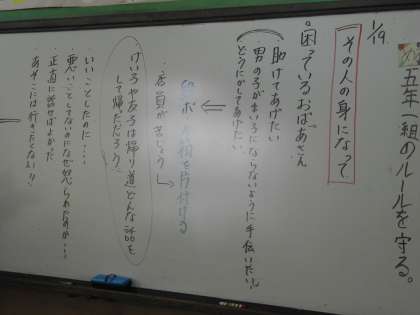道徳の学習の様子です。「くずれ落ちた段ボール」という読み物資料を読んで考えました。