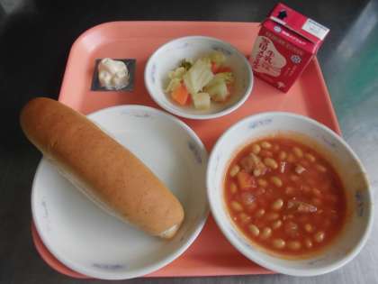 全粒粉パン・牛乳・大豆と鶏肉のトマト煮・野菜のホットマリネ・チーズ
