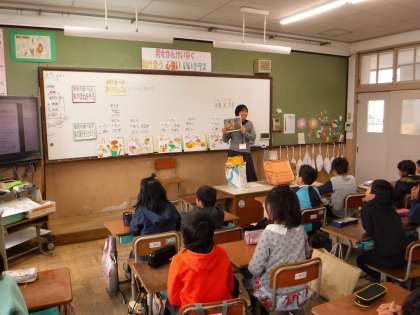 「力の研究所」という頭文字から,脂質の分類を5つ挙げていく子どもたち。ひとつ正解するたびに,「すごいね!」「やるねえ!」と褒め言葉をいっぱいかけて頂いて,3年生すっかりご機嫌です。食べものビンゴでは担任も参加して,一緒に盛り上がりました。