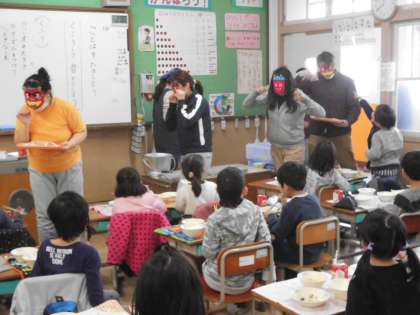 今日は、良い子にしている一年生の教室に『いり豆』を鬼になった調理員さんや先生で届けに行きました。皆、とっても喜んでくれていました。