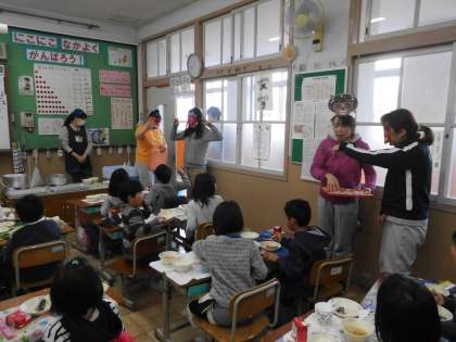 1年生の教室に給食時間,鬼が登場です。給食調理員さんたちが鬼のお面をつけて,わざわざ豆を配りに来てくれたのです。給食を食べていた1年生も大喜び。いつも以上に楽しい給食の時間になりました。
