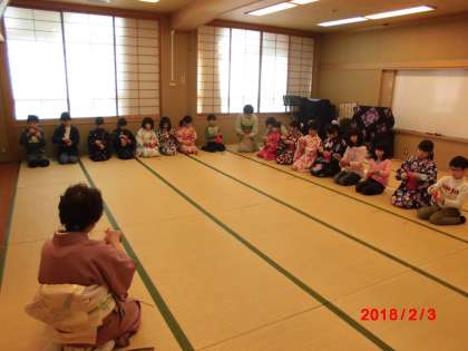 新春お茶会ということで,着物などを着て参加する人もいました。地域の方にお世話になり,お菓子とともにおいしくいただくことができました。