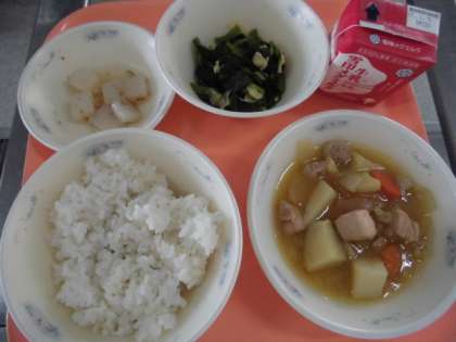 麦ごはん・牛乳・鶏肉と野菜の煮つけ・かみなりこんにゃく・小松菜とゆばの煮びたし