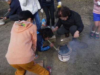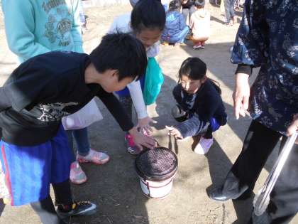 地域の方々に来ていただき,七輪でお餅焼きをしました。前回,昔の暮らしについてお話をしていただきましたが,今回は昔の道具を実際に使っての体験です。現代では簡単に火をつけることができますが,炭に火をおこすには少しコツがいります。コツを教えていただきながら,一緒にお餅を焼いていきました。