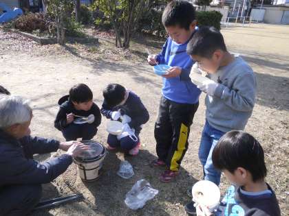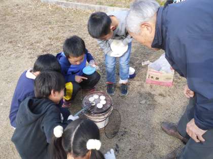 お餅が焦げないようにひっくり返したり,火に温まってお話したりしながら,お餅を焼いていました。焼きあがったお餅を早速にいただきましたが,香ばしいにおいもして,おいしくいただくことができました。