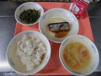 さんまのしょうが煮・だいこん葉のごま炒め・キャベツの吉野汁