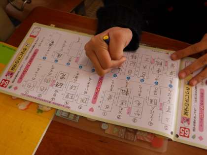 「先生出来たで!見て!」と,意気揚々と持って来てくれるのは漢字ドリルです。すべてのページの新出漢字とドリルを終えて,復習のページを書き込んだ子から教師のところに持って来ます。誤字ややり残しがないか,1ページずつ一緒に確認しています。