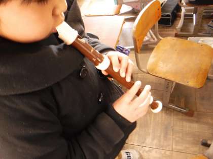 傍らを見ればリコーダーを構えた子が今か今かと待っています。「山のポルカ」「パフ」などの曲をマスターした子は,3年生の最後の器楽教材「エーデルワイス」に挑戦中です。つっかえたり音を外したりと,なかなか合格がもらえない子どもたちですが,「もう一回!」とひた向きに挑戦して来ます。熱意のある子はアルトの副旋律のメロディも練習しています。