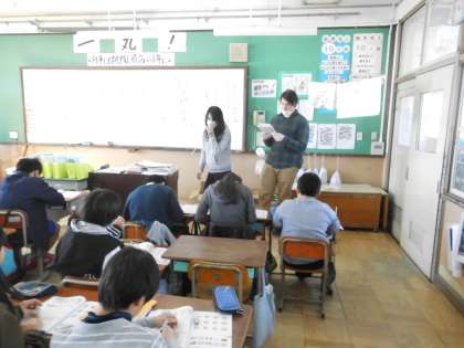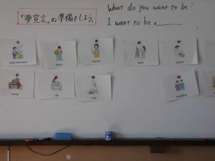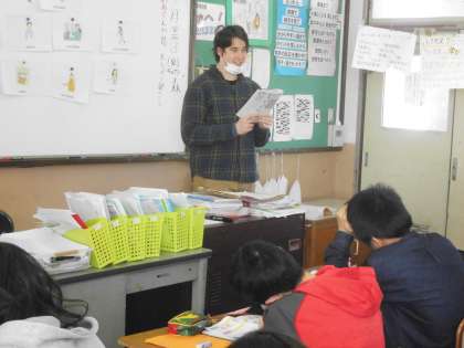 ALTのマシュー先生と一緒に外国語活動の学習です。マシュー先生が話す言葉を聞いて,何を伝えているのか考えます。みんな真剣な表情で聞いています。