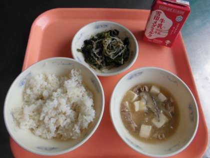 麦ごはん・牛乳・豚肉ととうふのくず煮・ほうれん草ともやしのごま煮