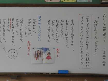 道徳の学習の様子です。「おばあさん,どうぞ」という読み物資料を読んで考えました。自分たちの経験もふまえながら,みんなで意見を交わして考えていきました。