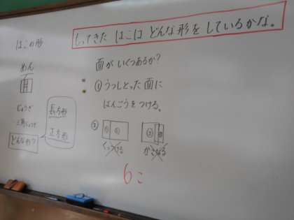 算数では「はこ」を使って学習です。「はこ」を目の前にして,どんな特徴があるのかみんなで調べていきました。