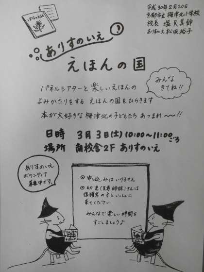 明日3月3日(土),10時からありすのいえで読み聞かせ会「えほんの国」があります。たくさんの楽しい本を読み聞かせてくれます。一緒に楽しいひと時を過ごしたいですね。お待ちしています。