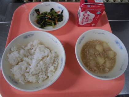 麦ごはん・牛乳・じゃがいものそぼろ煮・だいこん葉のおかかいため
