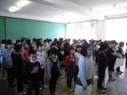 6年生を送る会に向けて,2年生も練習です。歌と言葉をおくります。一生懸命な2年生。元気な歌声が中庭まで響いていました。