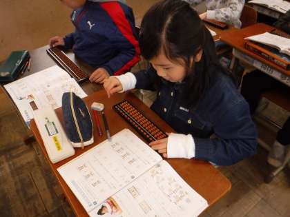 算数科ではいよいよ最後の単元,そろばんの学習に入りました。これまで学習の合間に,1玉・5玉の入れ方と,人差し指・親指の入れ方・払い方は練習して来ました。今日は少し発展して,5玉を入れて,4玉はらう,など,和が5を超えるたし算に取り組みました。少しずつ習熟して欲しいと思っています。