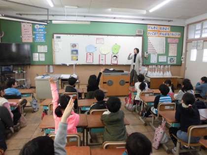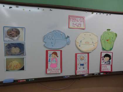 今日は、「すききらいなく食べる」ことについて、早田先生と一緒に勉強しました。残された食べ物の気持ちを考え、食べ方について考えることができました。1年生は今週が1組、来週は2組がランチルームで給食です。好き嫌いせず給食の時間を楽しんでほしいです。