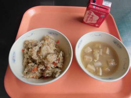 今日の『炊き込み五目ごはん』は、学校で保管していた乾燥人参・まぐろ油漬・たけのこ・干し椎茸・精白米を、給食室で炊き上げました。『みそ汁』も、油揚げ・切り麩・学校で保管していた野菜(乾燥キャベツ・乾燥ごぼう)を使って作りました。