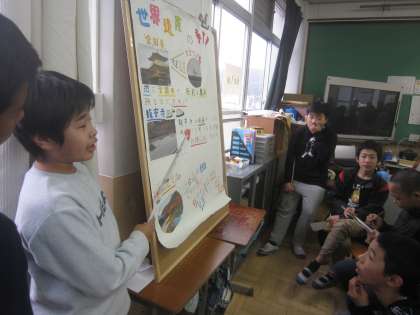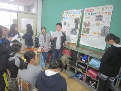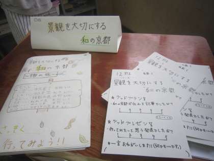 総合的な学習の時間に京都のことを調べてきて,ガイドブックにまとめてきた6年生。今回は5年生に向けての発表です。昨年度5年生の時は発表を聞く側でしたが,今年は5年生に聞いてもらいます。少し緊張しながらも,自信をもって発表する姿が印象的でした。