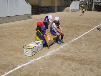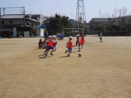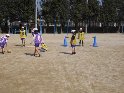 体育では「ボールけりゲーム」をしています。シュートが決まるとみんなで喜び合います。勝負がつくと,喜んだり悔しがったり。みんな一生懸命です。審判や得点などもみんなで協力してやっています。