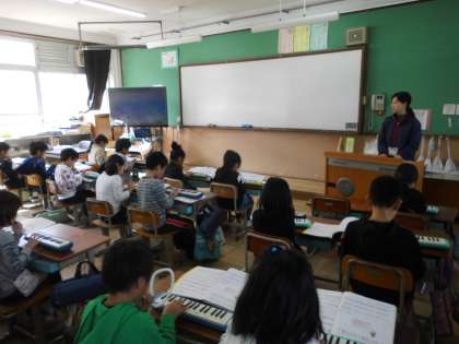 音楽の学習の様子です。先生の伴奏に合わせて,鍵盤ハーモニカで演奏です。歌は「はるがきた」をみんなで歌いました。この季節にぴったりの歌です。みんな気持ち良さそうに歌っていました。