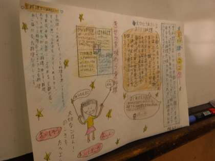 総合的な学習の時間で制作した,「京都の伝統・文化」のポスターを発表しています。京菓子や寺社,京野菜など,社会科で学習した京都市の地理を活かしながら,学習を広げています。郷土を愛し地域に生きる子となってくれることを願います。