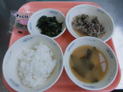 子どもたちから、「『春のみそ汁』春が感じられて、とっても美味しかったです。」と、感想をくれました。一年生は、『桜もち』を初めて食べるという人もいたようで、「さくらの葉っばが、苦手。」という人もいましたが、「美味しい」と、喜んで食べていた人も沢山いました。