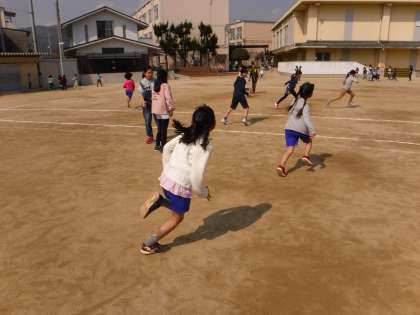 みんな遊びのメニューは「けいどろ」。1年間で少し大きくなった体で,目いっぱい運動場を駆け回りました。