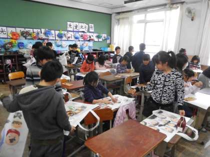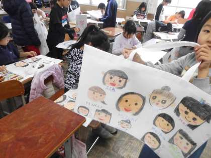 作品バッグに思い思いに絵を描いて,マイ作品バッグを作成しました。そして,今年一年作った作品を入れて持って帰ります。お家でも,この一年を振り返ってみてほしいです。