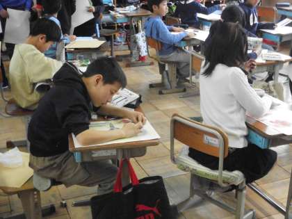 図工の時間,今年一年の思い出の場面を絵に表しました。夏の思い出,冬の思い出,部活の思い出,みんなそれぞれに思い出が違います。でも,各自の思い出がつまった作品,どれも素敵です。