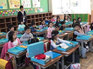 1年生の教室では,ランドセルの片付け方,お道具箱の整理の仕方などを教わりました。学習bの基本である「話を最後まで聞くこと」「姿勢よく椅子に座ること」についてもお話がありました。3組さんでは少し体を動かす遊びも取り入れました。