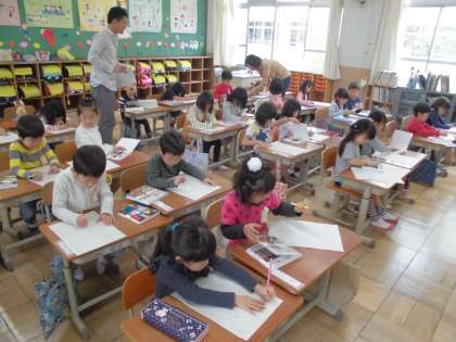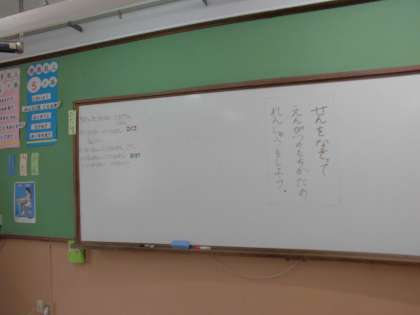 鉛筆やクーピーをもって,線のなぞりがきをしたり,自分の名前をひらがなで書いたりしました。机に貼ってある名前を見ながら,カードにバランスよく名前を書きました。正しい鉛筆の持ち方になるように気をつけようね。