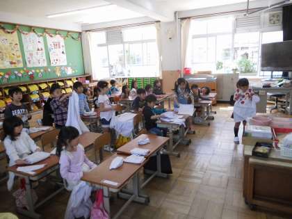 授業が始まり,今日はエプロンのたたみ方を確かめたり,国語の教科書を使って出てくる言葉を見つけたりしました。