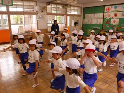 今日は朝からあいにくの雨模様で,教室で軽い体操をしました。2回目にしてしっかりと体操服に着替え,整列もなかなか様になって来ました。